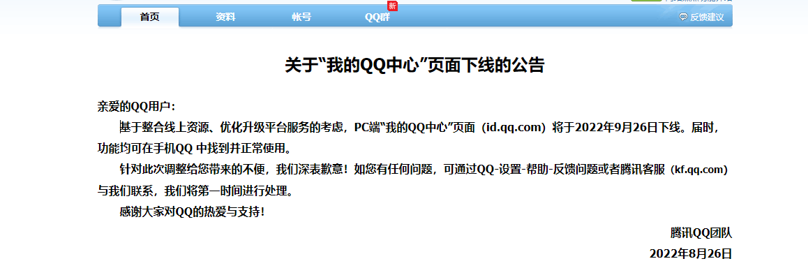 据腾讯 QQ 团队发布的公告,我的 QQ 中心页面将在 2022 年 9 月 26 日下线,下线原因是整合线上资源、优化升级平台服务等考虑。