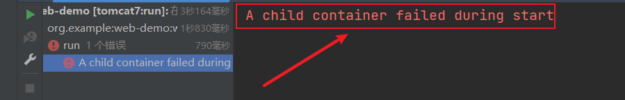 今天在学习JavaWeb的时候,使用Tomcat启动项目,发现项目报错,我当时以为又是端口占用了,然后我打开控制台查看,发现就一个行错误代码:A child container failed during start,而且不是昨天那个端口占用的代码,就以这个就可以无视端口占用问题。